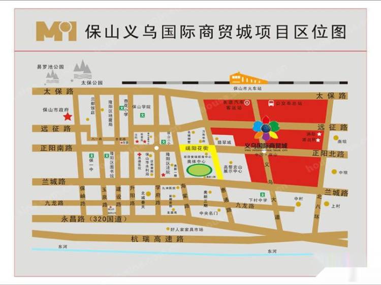 保山义乌国际商贸城是由全国民营企业500强的浙江茂华集团为、上海黄浦建设发展集团、湖南金易德公司等企业强强联合组建,并成立保山茂华义乌国际商贸城有限公司为本项目开发营运主体。集团拥有雄厚的资金实力和品牌开发力。本项目是集团在保山 100亿元倾力打造的以商业为主体大型城市综合体项目。 项目位列于保山市隆阳区北新区,北至北八环路、南至惠通路、东至兰城路、西至建设中的大瑞铁路保山站。北新区作为保山未来的 ,完善的项目配套设施不仅满足项目自身的需求,更能带动周边区域的发展。保山义乌国际商贸城正临保山火车站、奥体 ,项目内部规划汽车客运站、公交总站等生活配套正是该区域 的体现。此区域成熟后将是一个集交通换乘、商业贸易、 办公、文化娱乐、 医疗、生活居住等复合功能的城市新 。 项目总规划用地面积1400亩,总建筑面积260万㎡,商业130万㎡,住宅130万㎡。地下停车场面积53万㎡。总体建设分三期进行开发。我们正在对项目一期进行开发销售。商业部分产权为40年,住宅为70年。