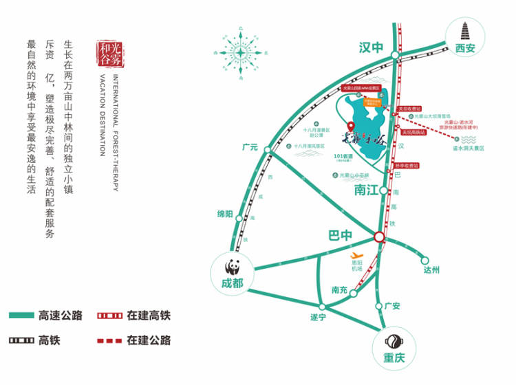 距项目约110公里的巴中恩阳机场已经通航,目前已开通至成都、上海、深圳、银川的航班,后续还将陆续开通其它城市航线,快速通达全国