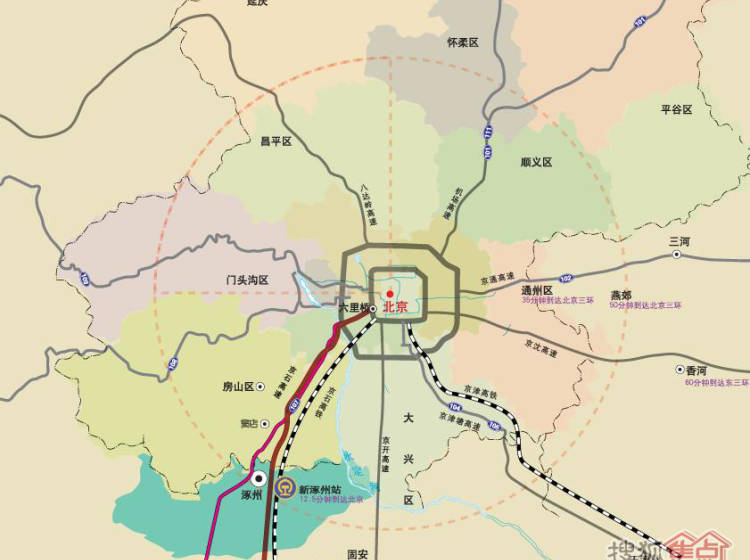涿州,北京经济圈紧密圈层,大北京规划新七环,第二机场经济圈,地理位置优越,近100家中央直属单位和知名大型零售店入驻,享有“京南门户”之称。交通非常便捷,京石高速和已经开工修建的京石高铁(2012年建成后12即可直达北京西三环)贯穿而过,京石第二高速也即将开工修建,极大缩短通勤时间。涿州是全国历史文化名城,三国文化的发祥地,人杰地灵,名胜古迹众多,并以中央电视台涿州影视基地和京都旅游度假区为龙头,谋划建设了一批具有带动作用的旅游项目。随着京、津、冀一体化进程的加快和“环渤海经济区”合作机制的形成,涿州已经融入大北京经济圈紧密层,众多中央部属科研单位和院校,京城超市、连锁店、酒店餐饮纷纷抢滩登陆,房地产市场也酝发出巨大潜力,以文明生态“宜居地”为特征的京郊生态卫星城正在形成。东燕郊、南涿州,随着大量北京客户涌入,涿州成为北京七环内具投资价值的区域。