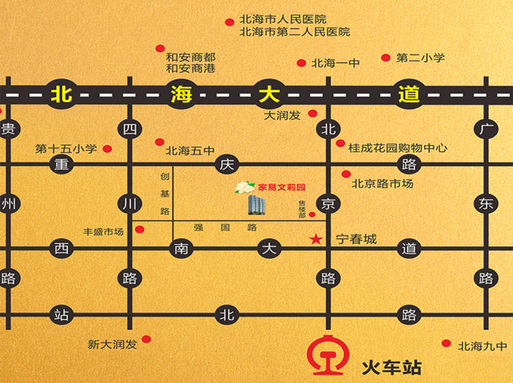 家易文莉园位于北海市海城区强国路海关宿舍的斜对面,项目地处北海的新商圈,座落于北京路和强国路交汇处的西北角。周边的交通四通八达;东临北京路、南临西南大道、西临四川路、北临重庆路,出行非常便捷。周边的生活配套非常完善,以小区为中心到市中心的各大商场、学校、医院、银行、菜市场等仅需10分钟左右的车程。其中从小区去到北海较大较高档的综合商场宁春城仅需步行3分钟,里面吃喝玩乐一应俱全。往南再步行10分钟就到北海高铁总站,出游、出行都非常便利的;您都不需要打出租车了,拉着行李箱散步就能到达。小区周边名校林立,与小区一街之隔就是北海排名前列与国际接轨隶属英国牛津集团的贝思乐幼儿园;小区还是市十五小和市五中的学区房,车程仅需10分钟,选择文莉园您的孩子就能享受到最优质的教学资源。同时小区还比邻北海两栋新的城市地标建筑,分别是高255米(63层)和247米(61层)的排名前列第二高楼,处于这块飞速发展的少有商圈中,小区的升值空间潜力无限。小区虽然坐拥繁华,处于北海的新商圈和动车商圈,但是却闹中取静;围绕在小区周边都是三层高的高档别墅区,居住环境是非常安静舒适的。