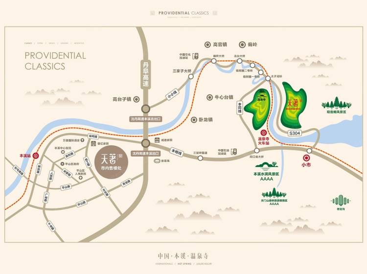 本溪市到天著:沿本桓公路,就可以直接到达项目,距离小市只有10分钟的车程,临近本溪水洞风景区。