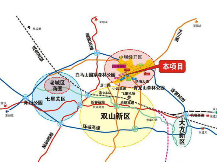 项目处于交通枢纽位置,四维交通,四通八达,其中毕海大道,小坝大道,主一路,主二路,次一路。次五路,力帆路,骏马路,振兴路等纵横交错;小瓦高速,毕海大道,机场快速,环北高速的开通,直接连通贵毕公路,与中心城区以及周边城县形成了城市15分钟生活圈;轻轨2号线经过,在项目附近就有一个站点直达。飞雄机场距项目仅5分钟;成贵铁路正在建设当中。