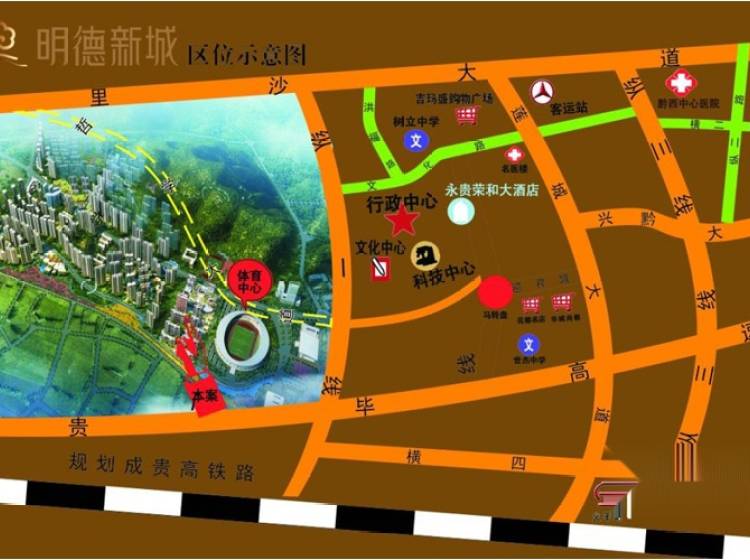 公共设施:体育馆、游泳馆、篮球馆、科技馆、文化馆、紧邻行政中心,健身馆及目前的新城中心马转盘,华晨医院,世杰中学,树立中学。 医院:华晨医院、铭医楼医院、黔西县中心医院 银行:中国建设银行、工商银行、中国农业银行、中国银行、农村信用社。 休闲娱乐:港尊KTV、港尊水会、湘黔百年、钻石钱柜量贩KTV、餐饮。 酒店: 永贵荣和大酒店、阳光大酒店、一逸连锁酒店、佰里仟庭酒店、塔尔肥牛、顺水鱼馆、蘑菇煮意。