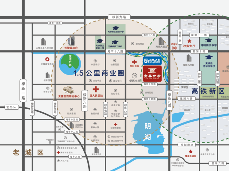 项目自带居然之家商业家居综合体,距离盐百购物中心仅有2公里,西侧馨怡社区便民市场。无棣县政府,东侧政务服务中心。小区自建幼儿园,北侧紧挨无棣县第三实验小学,初中,高中,无棣县技工学校。距离无棣县人民医院 仅有1.2公里,项目西侧棣丰社区医院,项目北侧棣州医院。
