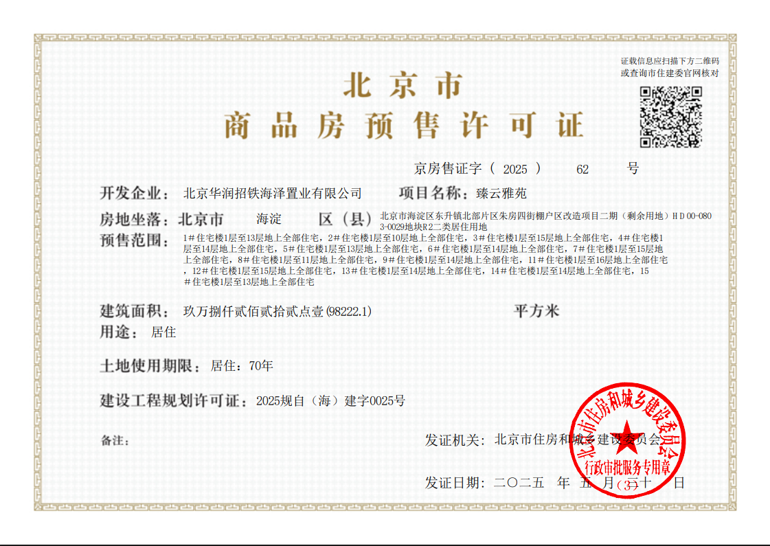 - 京房售证字(2025)62号 详情发证时间 2025-05-30绑定楼栋1#住宅楼1层至13层地上全部住宅,2#住宅楼1层至10层地上全部住宅,3#住宅楼1层至15层地上全部住宅,4#住宅楼1层至14层地上全部住宅,5#住宅楼1层至13层地上全部住宅,6#住宅楼1层至14层地上全部住宅,7#住宅楼1层至15层地上全部住宅,8#住宅楼1层至11层地上全部住宅,9#住宅楼1层至14层地上全部住宅,11#住宅楼1层至16层地上全部住宅,12#住宅楼1层至15层地上全部住宅,13#住宅楼1层至14层地上全部住宅,14#住宅楼1层至14层地上全部住宅,15#住宅楼1层至13层地上全部住宅证件照片