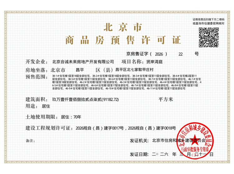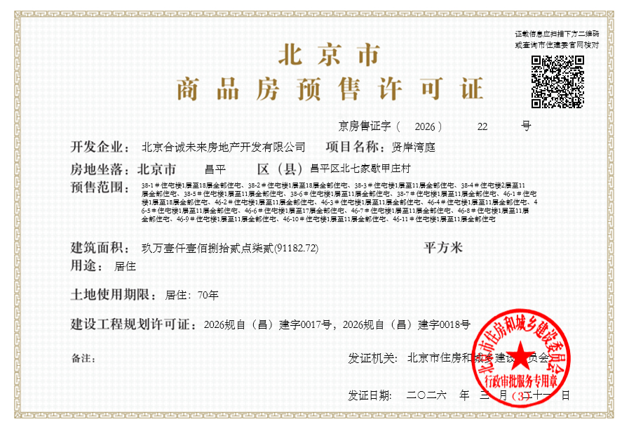 - 京房售证字(2026)22号 详情发证时间 2026-03-21绑定楼栋38-1#住宅楼1层至18层全部住宅、38-2#住宅楼1层至18层全部住宅、38-3#住宅楼1层至11层全部住宅、38-4#住宅楼2层至11层全部住宅、38-5#住宅楼1层至11层全部住宅、38-6#住宅楼1层至11层全部住宅、38-7#住宅楼1层至11层全部住宅、46-1#住宅楼1层至18层全部住宅、46-2#住宅楼1层至11层全部住宅、46-3#住宅楼1层至11层全部住宅、46-4#住宅楼1层至11层全部住宅、46-5#住宅楼1层至11层全部住宅、46-6#住宅楼1层至17层全部住宅、46-7#住宅楼1层至11层全部住宅、46-8#住宅楼1层至11层全部住宅、46-9#住宅楼1层至11层全部住宅、46-10#住宅楼1层至11层全部住宅、46-11#住宅楼1层至11层全部住宅证件照片