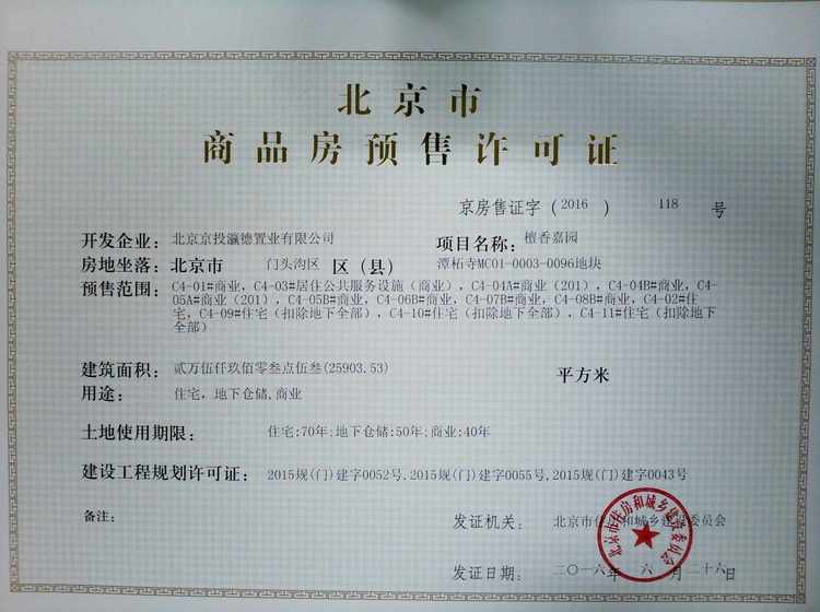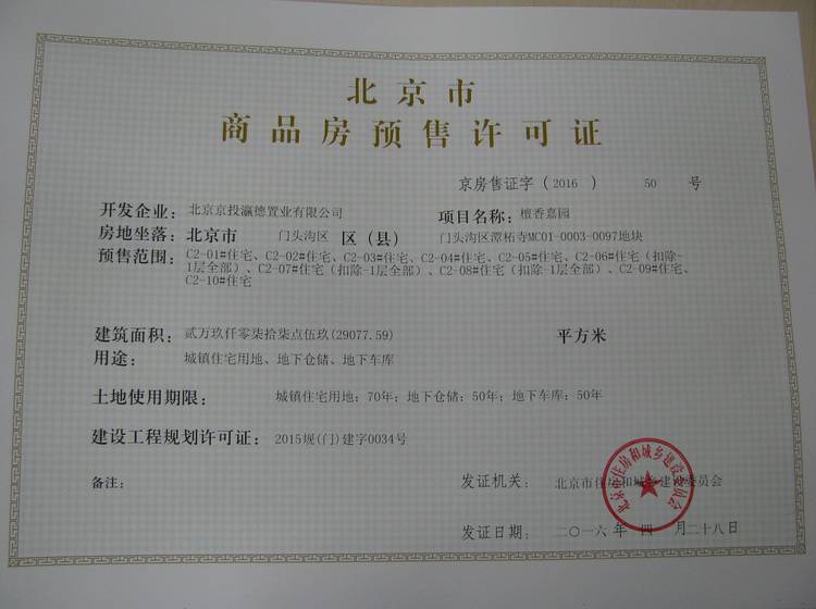 - 京房售证字(2019)79号 详情发证时间 2019-07-26绑定楼栋C5-01#住宅楼-1层至6层全部房屋(扣除-1层消防、安防控制室),C5-05#住宅楼1层至6层全部房屋,C5-06#住宅楼1层至6层全部房屋(扣除6层附属层层人防),C5-10#住宅楼-1层至6层全部房屋(扣除-1层-105)证件照片