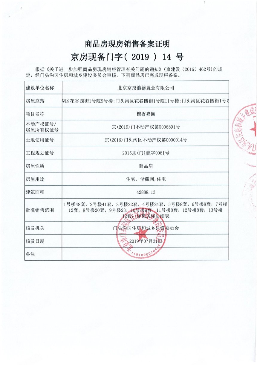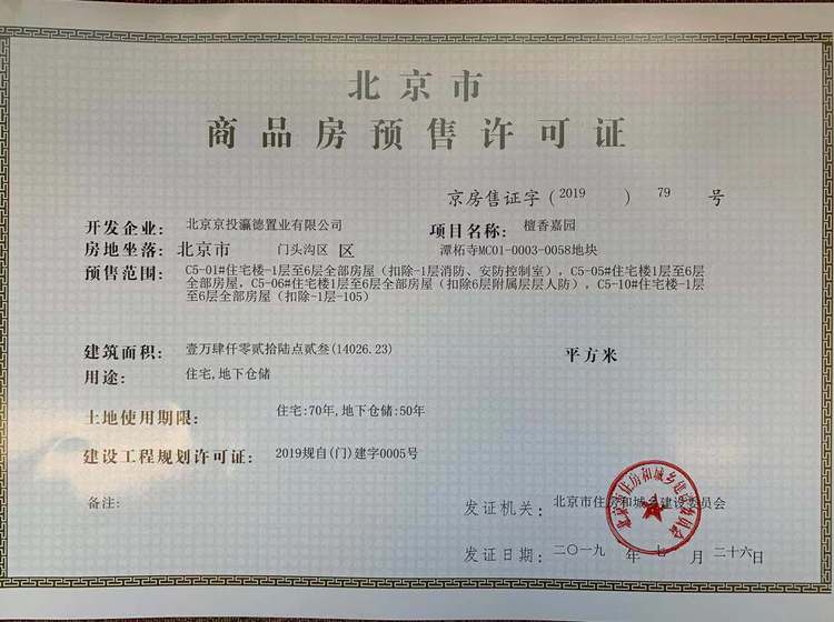 - 京房售证字(2019)79号 详情发证时间 2019-07-26绑定楼栋C5-01#住宅楼-1层至6层全部房屋,C5-05#住宅楼-1层至6层全部房屋,C5-06#住宅楼-1层至6层全部房屋,C5-10#住宅楼-1层至6层全部房屋。