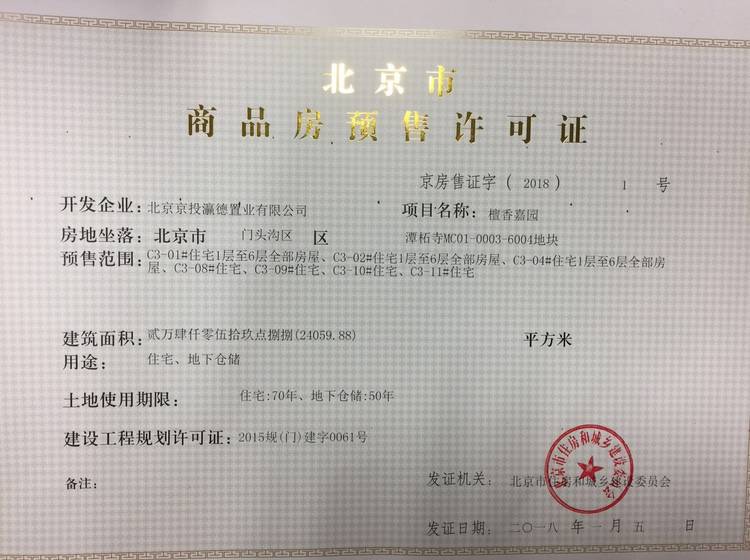 - 京房售证字(2018)1号 详情发证时间 2018-01-05绑定楼栋C3-01#住宅1层至6层全部房屋、C3-02#住宅1层至6层全部房屋、C3-04#住宅1层至6层全部房屋、C3-08#住宅、C3-09#住宅、C3-10#住宅、C3-11#住宅
