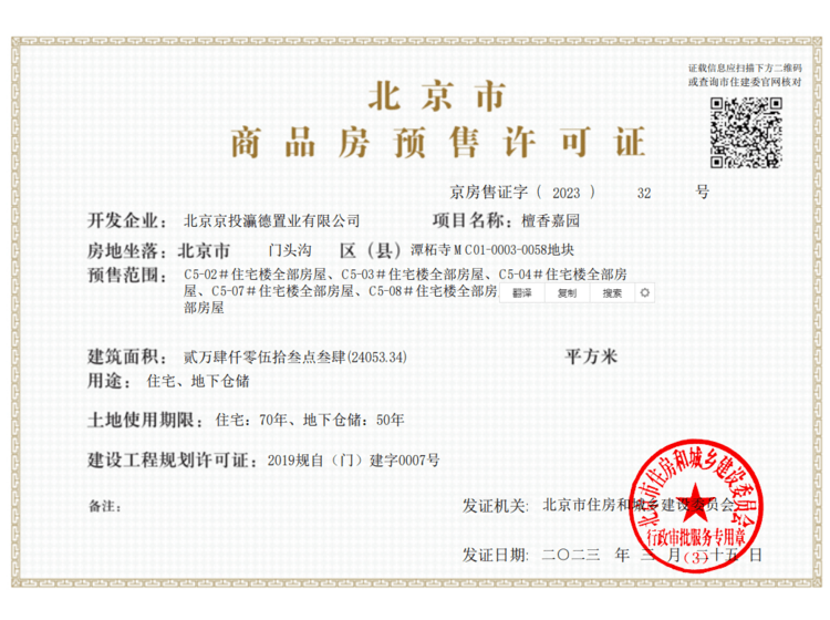 - 京房售证字(2023)32号 详情发证时间 2023-03-25绑定楼栋C5-02#住宅楼全部房屋、C5-03#住宅楼全部房屋、C5-04#住宅楼全部房屋、C5-07#住宅楼全部房屋、C5-08#住宅楼全部房屋、C5-09#住宅楼全部房屋证件照片