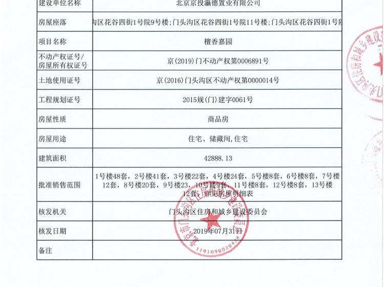 - 京(2019)门不动产权第0006891号 详情发证时间 2019-08-01绑定楼栋C3-01#、C3-02#、C3-04#、C3-03#、C3-05#证件照片