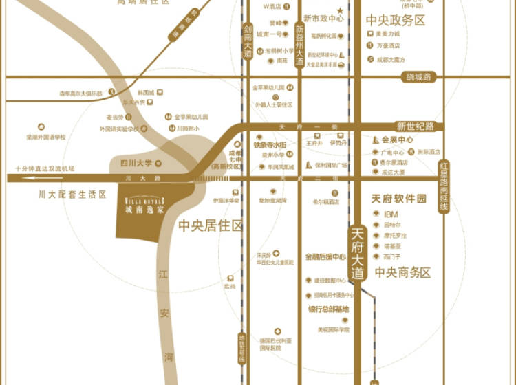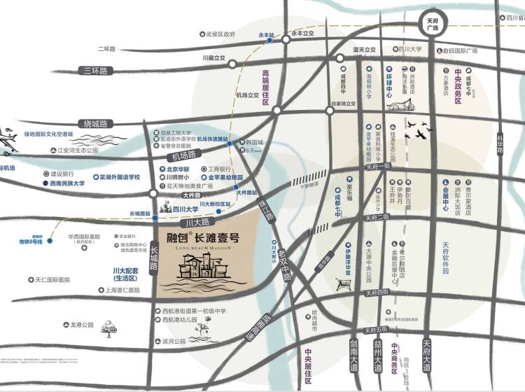 融创长滩壹号位于川大江安校区旁。项目占据约1.2公里江安河长滩,临河打造10万平米滨河生态公园,以“原湾独栋、流水联排、院落叠墅”三大别墅形态,造成都约400亩原湾纯别墅社区。项目离天府一街约4公里,距环球中心约9公里。