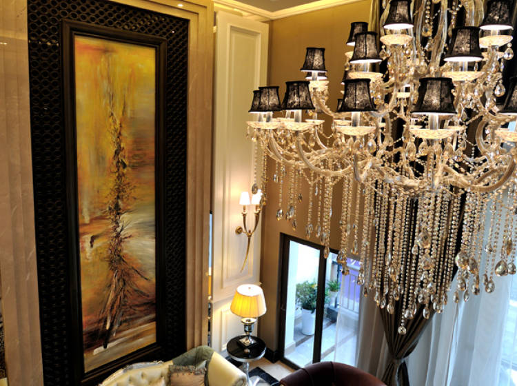 成都天穹会所,总建筑面积为6000平米,内设恒温泳池、拉菲红酒房、媲美长安俱乐部的VIP私人会客厅、450平米透天下沉式庭院、鲁哇咖啡厅等配置。