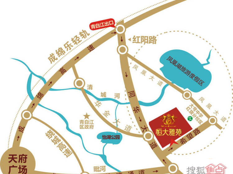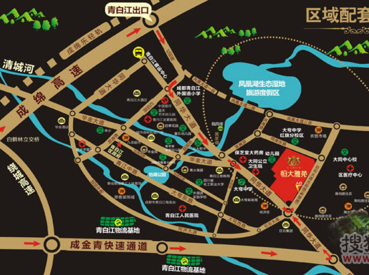 恒大雅苑位于青白江同华大道生态走廊之上,紧邻规划中的凤凰湖湿地公园。项目总占地约85000平米,建筑面积约41万平方米,规划建设约11000平米欧陆风情商业街、约11000平米恒大影院、约5200平米的名流会所以及约2000平米的国际双语幼儿园。