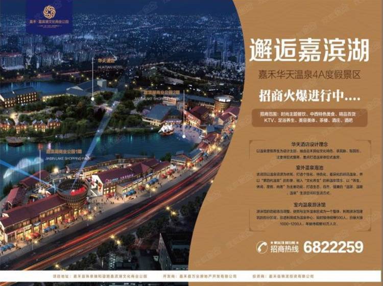 嘉滨湖文化商业主题公园项目及华天温泉度假酒店,依托嘉禾温泉资源,结合嘉禾的餐饮、民歌等民俗文化和地域特色,引进了湖南华天酒店集团、肯德基全国连锁机构、奥特莱斯品牌折扣店(全国连锁)、韩国拉斯卡宝贝宫殿、爆米花娱乐、芒果电影、潇湘剧院、湖南省餐饮协会、等国内知名品牌,由北京先进旅投定制式的商业旅游策划、湖南合众商业管理有限公司专业商业运营,按照目前最前沿的商业旅游+娱乐休闲+体验式消费的开发理念,以“商业旅游、休闲娱乐、风情体验”为整体商业核心理念,打造以温泉度假、青少年体验式教育活动、民俗文化、健康养生、餐饮、娱乐、现代商业为核心主题七大版块的现代旅游商业综合体项目。