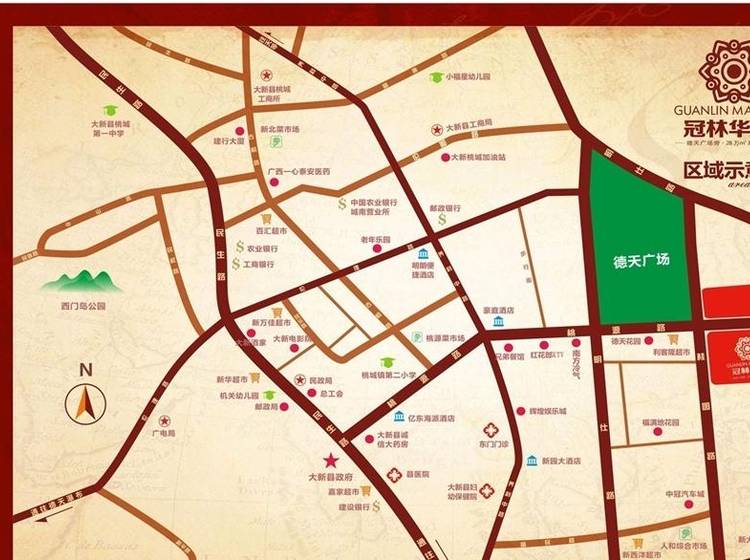 冠林华府楼盘项目介绍: 冠林华府位于大新县东片区德天广场旁,该地域景观上有得天独厚的优势,位置优质且商业氛围日趋成熟,用地和周边交通便利,配套设施齐全,是城市未来发展的地标式地块。项目占地面积约100亩,总建筑面积约28万平方米,属大新规模楼盘。总体分两期开发,一期占地面积约60亩,基地西临桂圆路,整个地块规划为商业酒店用地、商住用地,幼儿园用地三大块。一期高档住宅电梯花园洋房开盘即售罄,达“日光盘”的效果,在大新创造历史传奇。二期占地面积约40亩,位于德天广场正对面,是大新县后一块临近广场地段的开发用地,地段稀缺珍贵,无可复制,潜力巨大。