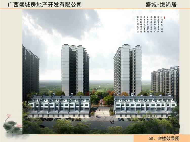 盛城.绥尚居位于扶绥县岜尧路109号(育才学校后),项目总建筑面积80000㎡,由3栋高层18层,1栋小高层11层,12栋联排别墅组成。容积率2.95,绿化率达到35.8%,停车比例高达1:0.8。南北通透N+1户型设计,楼间距60米,户户通透,采光充足。 项目依据现状环境条件,打造纯居住景观花园洋房社区,设计极具中式建筑特色的徽派风格元素,马墙头、小青瓦、白墙的搭配,为社区营造清俊淡雅的中式院落意境。园林景观以中国传统的私家园林为风格取向,融合坡地原生态地形地貌,以中式园林“借景生景、步移景换”为特点,小桥流水,亭台楼阁,水榭廊桥,还有花窗、竹林步道等中式园景,构造多层的园林空间。