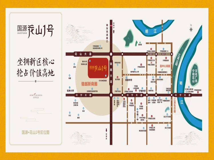 项目位于宁明县骆越大道与花山大道交汇处,处于宁明骆越新区的核心位置,作为城市新门户,将打造380亩品质大盘。骆越新区是政府重点打造的一个新区,将来就是宁明城市综合新城区,也是经济增长新核心,未来城市新枢纽和门面主要承载地。