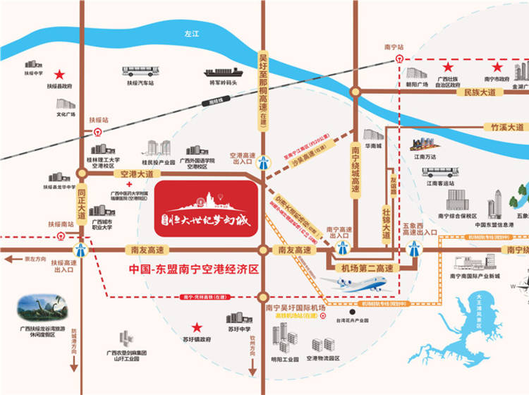 多维立体交通网,南宁吴圩国际机场、南宁机场轻轨专线,两铁为南宁-凭祥高铁与湘桂铁路,另有南友高速、空港大道、吴圩沙井高速、吴圩那桐高速、北流南宁高速、机场第二高速、友谊路-G210国道,依托南宁国际空港综合交通枢纽(GTC)项目,组建“一港、一轨、两铁、七路”的立体交通路网,将实现飞机、高铁、地铁、高速公路的零换乘,畅享南宁“15分钟经济生活圈”。
