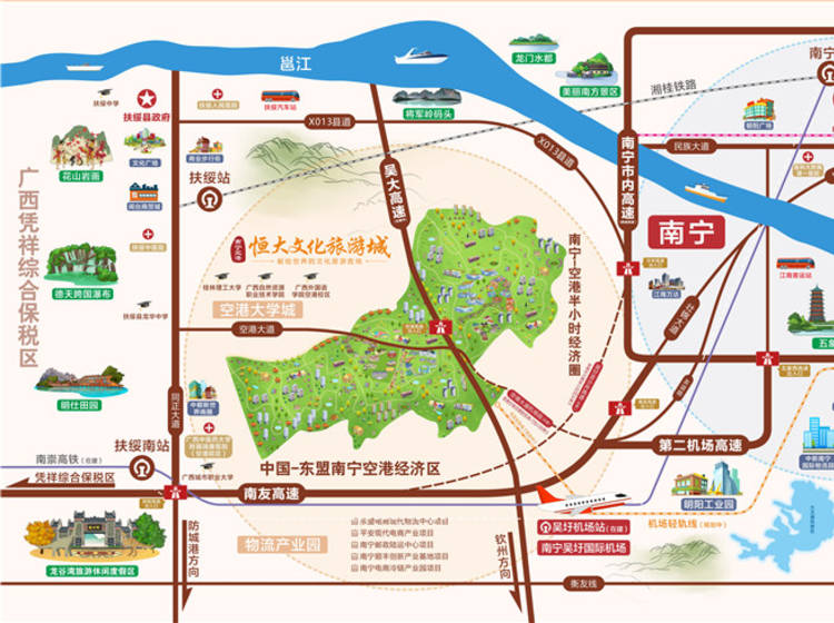 南宁空港恒大文化旅游城由世界500强企业恒大集团旗下恒大旅游集团倾力钜制,汇聚全球知名设计师,全方位构建文化旅游综合体版图。项目地处中国-东盟南宁空港经济区,南宁城市副中心,享南宁-空港半小时生活圈,坐享多维立体交通——机场、轻轨、高速、高铁,无缝连接城市生活,接轨国际生活。项目总占地28000余亩,规划打造恒大水世界、恒大养生谷、儿童世界、旅游世界、九国温泉城、世界文博园、美食天地、智慧农科园等八大国际高级配套集群,建成后将成为集游乐、文化、休闲、商业、旅居、疗养于一体的高级文化旅游康养胜地,其规模宏大、定位先进,将会开启广西居住3.0时代。