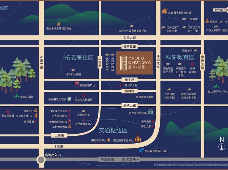 项目占地49亩,坐落于崇左城南新区,核心居住区,教育中心圈,周边10+所名校环绕,商业配套市政配套齐全,出则繁华入则宁静,设计上,采用现代化风格打造,外立面线条流畅,共由7栋楼组成,停车位超1:1的比例。小区内部采用人车分流的全新安全管理模式,绿化面积达到11443㎡,回家即是逛公园,采用独栋独单元纯点式布局,超百米楼间距,是不可多得的高圈层学区旁美宅。
