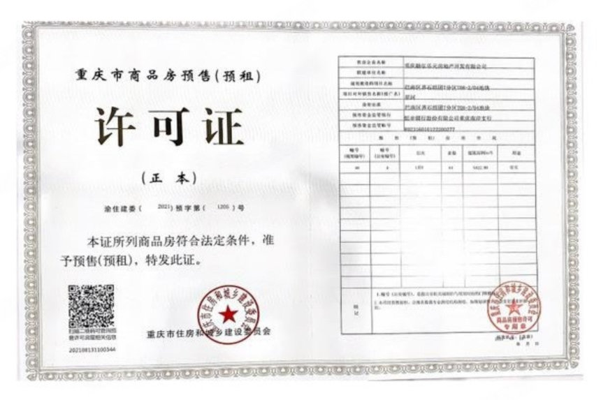 - 渝住建委(2021)预字第(1779)号 详情发证时间 2021-12-08绑定楼栋8#,9#