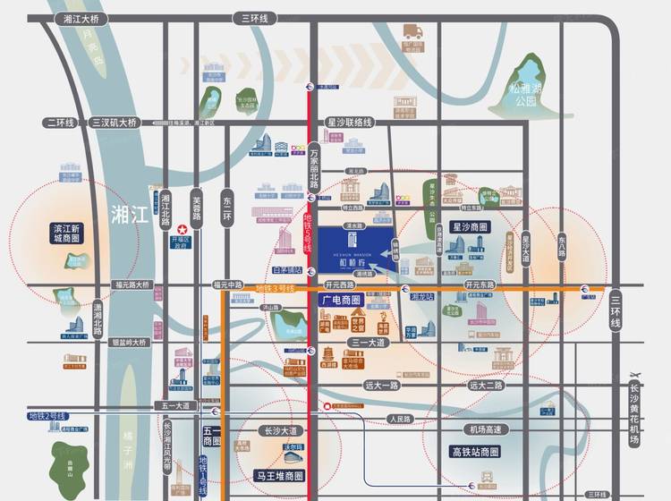学校: 项目自建幼儿园,与昌济小学一路之隔,距中南小学仅400米,百熙实验初中约800米,周边还有中南第二小学、湘龙小学、金鹰小学、师大附中星沙实验学校