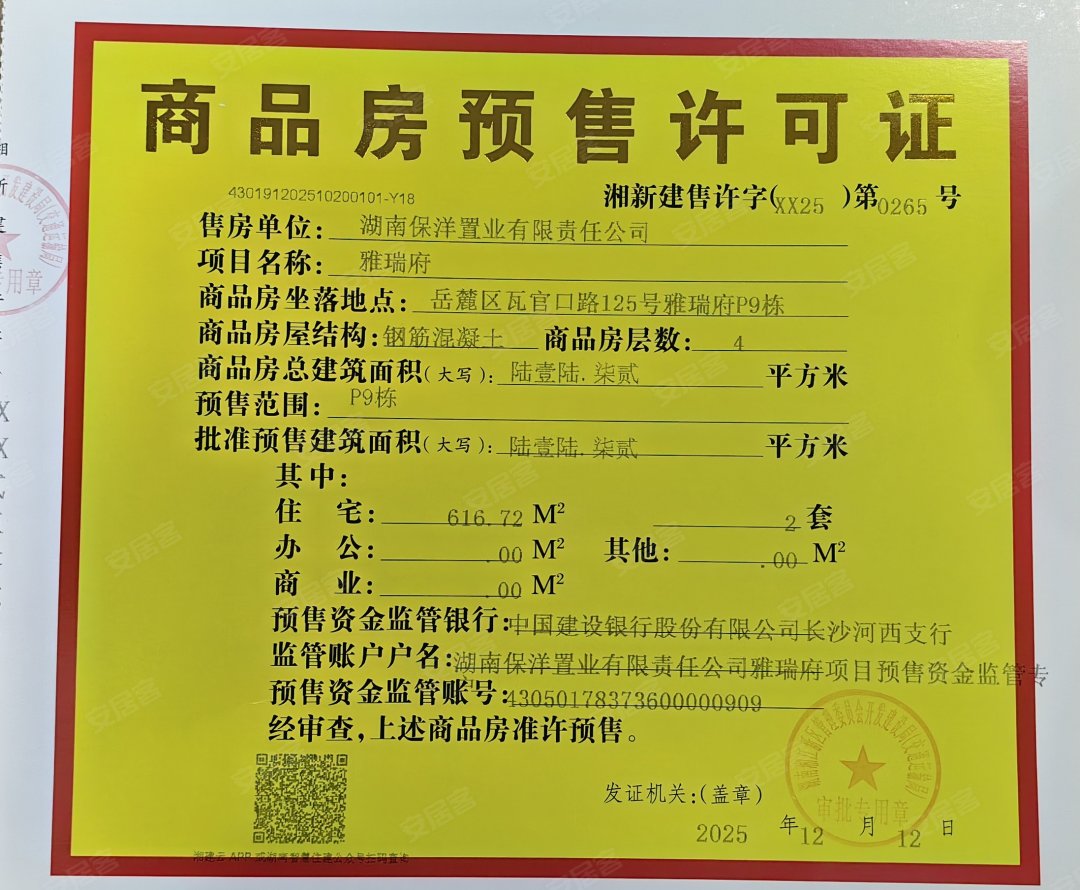 - 湘新建售许字(XX25)第0265号 详情发证时间 2025-12-12绑定楼栋P9#证件照片