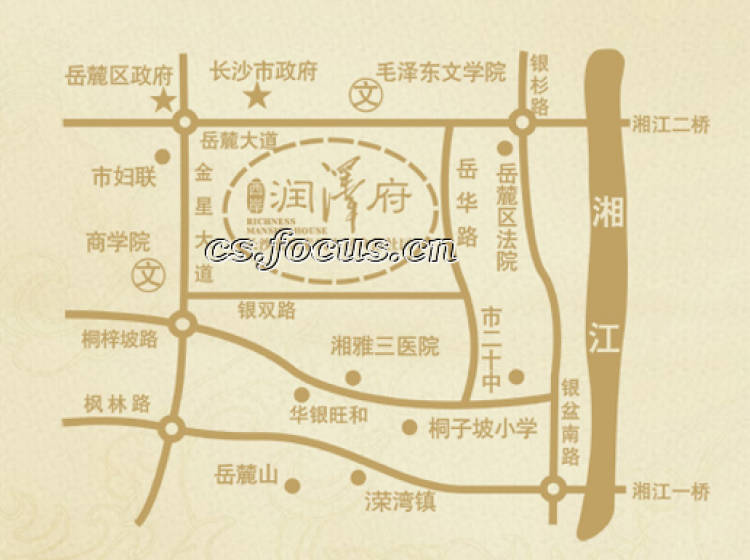 中小学:二十中、桐梓坡小学、商学院、中南大学中医学院、毛泽东文学院,综合商场:华银旺和,医院:湘雅附三医院,其他:望月湖公园