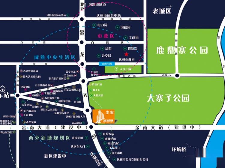 项目位于达州市通川区政府倾力打造的达州西外板块金龙大道48号,高速达州南出口必经之地,紧临连接西外与南外的规划道路金南大道咽喉位置,本项目未来将是城区之间的交流互动的中心枢纽区域。项目西临金龙大道,北临康馨花园,东临千亩大寨子公园,南临洲河,生活环境依山傍水,与达州机场、火车站、西客站咫尺相隔,生活配套设施齐全,十余条公交线路畅通全城,15生活圈,让生活的一切触手可及。 项目是由4幢高层1幢小高层围合而成的花园社区,低密度的花园社区安静舒适,私密安全,让居住者每时每刻都能体验到生活的优雅情调,自然由心而升。超大楼间距优质拓展视野空间,大大提高居家私密性,近万平中庭景观花园提供丰富休闲区域,数千平休闲广场为你居家休闲提供健康运动空间。千亩公园一墙之隔,公园出入口临墙而建项目自带数万平商业完全满足日常所需,便捷时尚生活唾手可得。 目前项目即将推出一期1-3号楼房源,面积区间89-136㎡,经典套二变套三,套三变套四户型,超大的赠送空间大大增加使用面积,房屋布局科学合理,明厨明卫,户户见景,属于西外片区首屈一指的超高性价比楼盘。 周边15步行范围内配套设施齐全,医院、银行、超市、学校应有尽有,更有达州机场、达州火车站、西客站三大交通枢纽,建设中金南大道直通南外,大寨子公园、车管所、信德广场、通川区第三人民医院、广播电视大学、行政中学等。