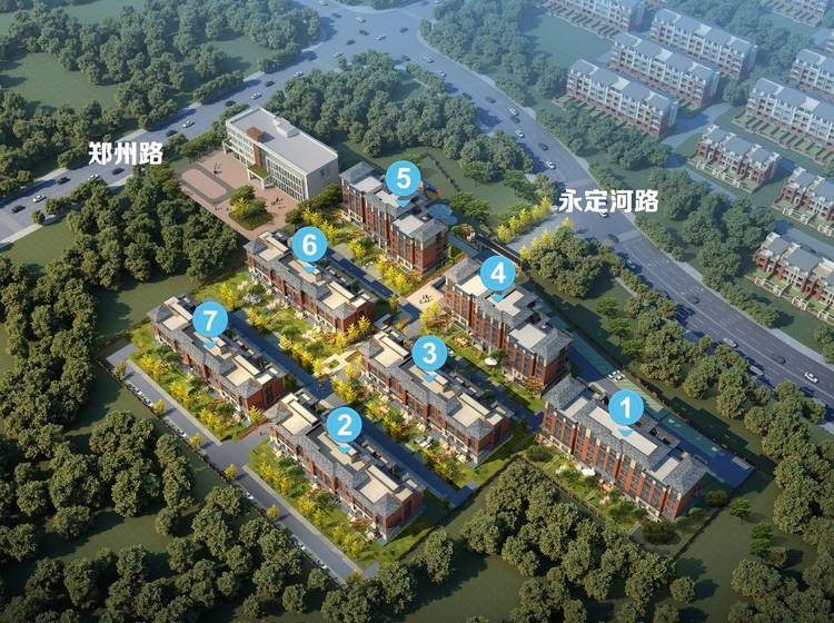 小区出入口布置是结合地块条件,在小区南侧布置主入、口,开向永定河路,形成开敞的入口形态,结合景观设计,打造大气景观入口。次入口设在西侧,北侧设置人行出入口;建筑布置基本呈匀布状态。高层组团沿西北角集中线性布置,形成高层建筑群,景观资源、日照资源得到高效利用;低层及多层组团呈行列式布置,各列住宅尽量错开布置,以丰富端单元的视野、景观。