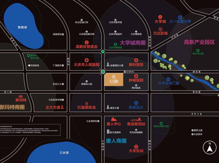 眼科医院(公交站):810路;环线巴士2路外环;医大妇产医院(公交站):33路;中央大都会(公交站):环线巴士2路内环;环线巴士2路外环;中国人寿大庆分公司(公交站):105路;805路;9路;康城东门(公交站):805路;景程小区(公交站):105路;33路;810路;9路;同创集团(公交站):810路;人才中心(公交站):105路;30路;临1路;庆联石化(公交站):33路;振富大厦(公交站):9路;