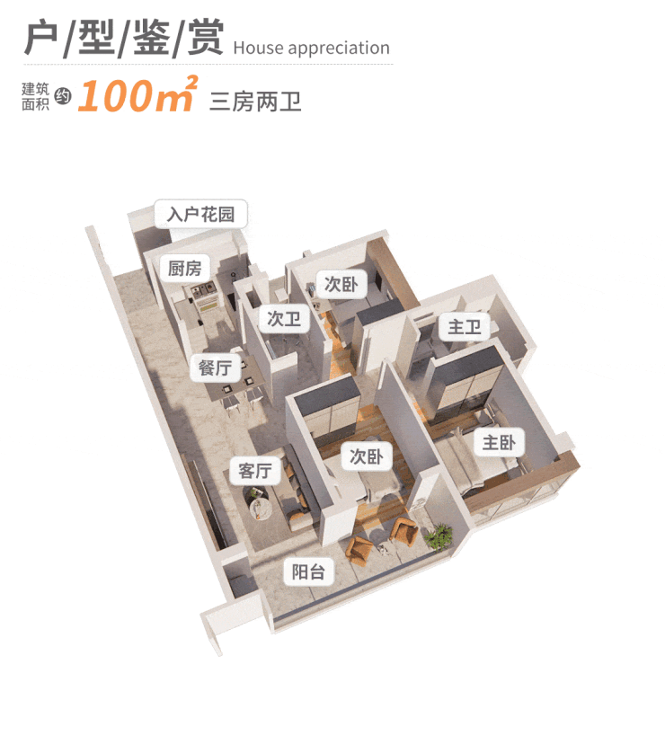 建面约80㎡三房,带入户花园,三个卧室都带飘窗,增强实用性。