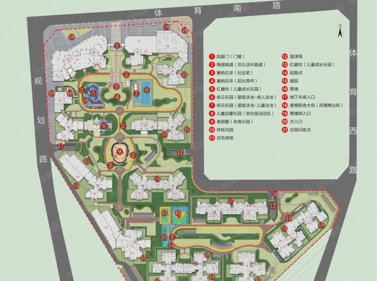 风情商业街、社区吧、儿童成长(启蒙)乐园、成人与儿童双泳池、老者乐园、多功能阳光草坪、多功能运动场、双乐活环跑道
