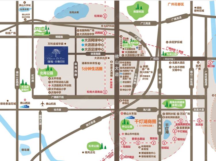 绿地香颂公馆地处广州、佛山两大都市交界处,大沥传统商圈地带,项目受广州荔湾、海珠商圈和千灯湖商圈影响,并在广州、佛山两个城市的驱动下,大沥片区将发展成荔湾西生活区。