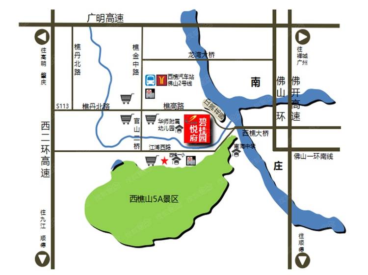 项目外接樵高路、西樵大桥、西樵大道,樵金中路,樵高路,官山二桥,海北东路,江浦东路,江浦西路,吉利大道西,禅西大道,崇民西路,樵乐路,佛山一环西线、佛开高速,广明高速,周边的交通十分便捷,公交线路贯穿广州,禅城、九江、桂城、大沥、狮山等;