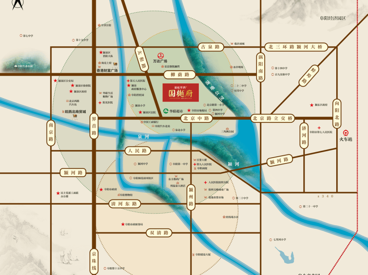 项目周边各主干道环伺左右,交通便利,出行方便;周边万达广场、香港财富广场万象城、阜阳市第五人民医院等,配套齐全,生活便利;自带15班幼儿园,周边数所优质中小学,提供3-18岁一站式优质教育链;更有四大湿地公园环伺,提供真正低密绿色的高端生活。