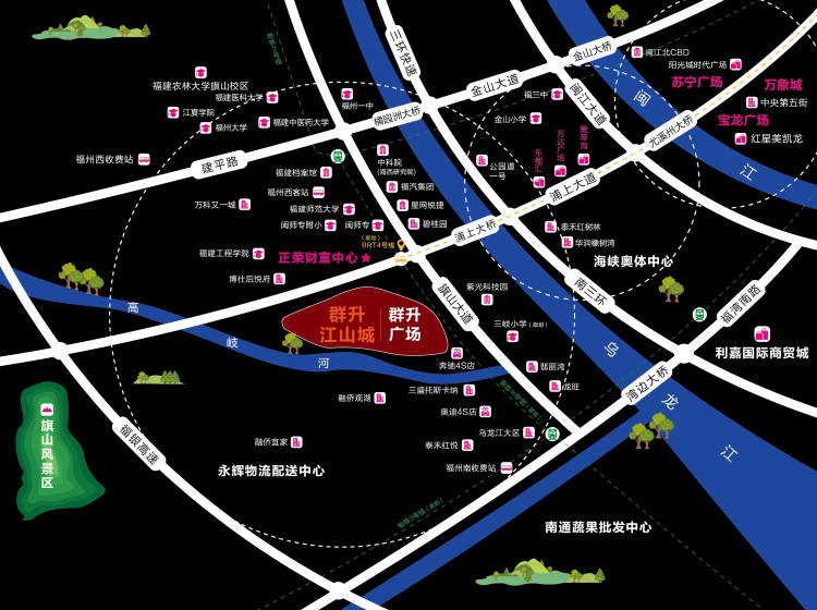 交通上,群升江山城拥有福州城际、城内最便捷的交通网络。对内交通上,“浦上大桥—尤溪洲大桥”,10分钟即到市中心;地铁2、3号线,政府重点工程确定上马;三环快速路,触控全市。对外交通上,福州南、福州西两大高速口,左右环伺;火车南站,咫尺之遥,通达八闽内外。