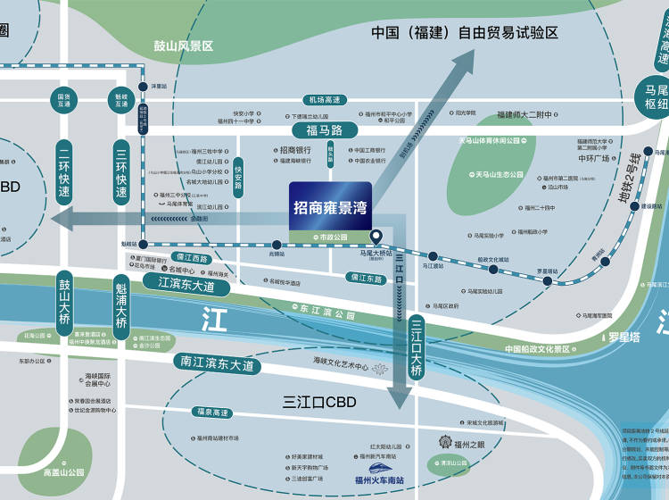 招商·雍景湾屹立福州东江滨核心位置,于规划中的地铁二号线延伸线地铁旁(马尾大桥站),出门经三江口大桥,快速通联仓山与马尾,四大跨江大桥接驳东江滨大道,环岛路、二/三环路等城市主干道串联大福州交通路网,快速直达福州火车南站、长乐机场,实现城际交通联动畅通。项目坐拥东江滨商圈,金融街万达商圈,共享三江口千亿配套,为集购物、教育、医疗、休闲等城市配套于一体的新派纯商品房住区!