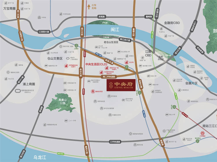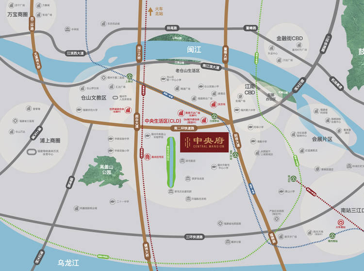 大东海中央府由大东海地产匠心打造约200亩大盘,正居老仓山千年文化地郭宅侧,毗邻地铁一号线,周围交通便利。项目规划住宅、SOHO、底商等产品,定制安全、绿色、健康与智能社区,规划全龄休闲配套,涵盖有景观漫步道、慢跑道、热力球场、萌宠乐园、亲子互动、动感天地、儿童乐园、对弈茶座、室外会客厅、林下空间、康乐、健体等满足社交、陪伴与健康主题社区配套。社区景观融入榕树、马鞍墙以及郭宅竹编文化等充满人文感的景观设计。