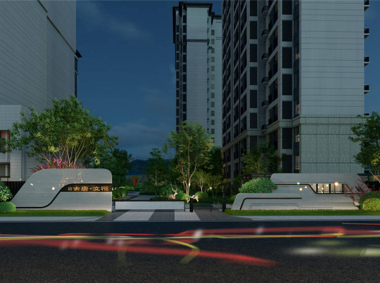 建筑风格:采用现代的建筑风格,整体简洁大气,建筑立面采用大唐“世家系”的新唐风设计手法,典雅而古朴;在屋檐正下方装饰“唐”字符元素,形成独特的大唐地产品牌风格。