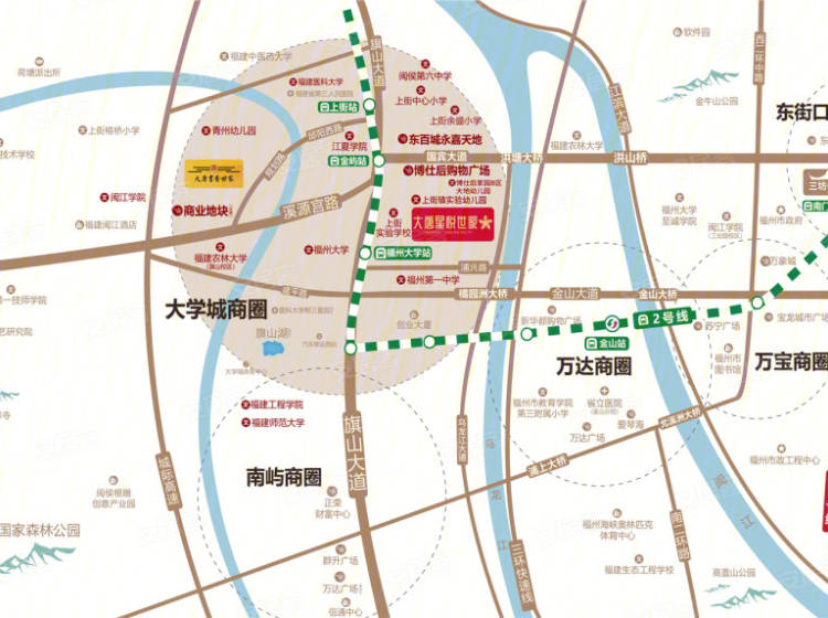 1、三横:▲橘园洲大桥,浦上大桥,洪塘大桥2、三纵:▲旗山大道、乌龙江大道、三环快速路【大唐星悦世家】离地铁2号线【福州大学站】仅约183m,地铁2号线起于苏洋站,止于洋里站,是连接福州东--西的大动脉,更是福州最核心的交通枢纽;
