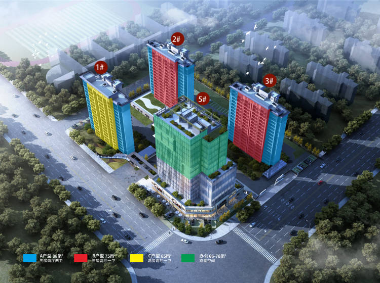 项目规划:项目总占地23.93亩,总建面积约5.3万方(容积率2.6,建筑密度25%,绿地率30%),由3栋17F的住宅,1栋14F的商务办公,采用围合式建筑布局,是大学城板块难得的低密度舒适社区。