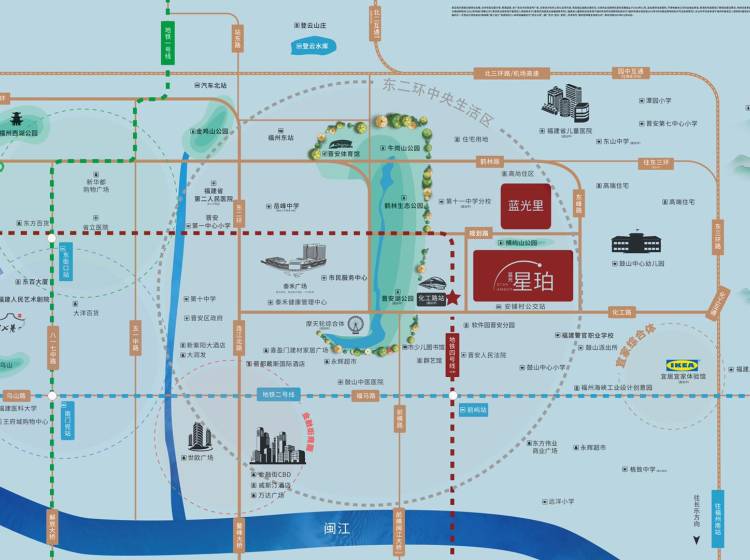 【5大商圈】海西大型城市综合体--东二环泰禾广场(约1.7公里)、全国最大宜家家居体验馆(约3公里)、东街口商圈(约5.3公里)、王庄商圈(约3.6公里)、台江金融街商圈(约4.2公里)5公里范围5大商圈为邻,繁华奢享。