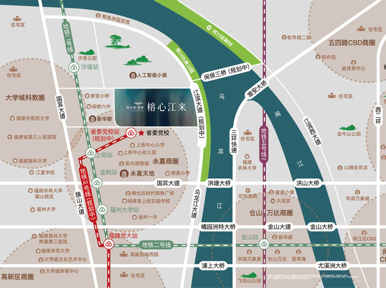 阳光城旭辉榕心江来位于上街新省委党校旁,近地铁2号线上街站、洪山桥—新洪塘大桥—项目地地铁接驳7号线(公交车)、闽侯三桥(规划中)、地铁A1线-省委党校站(规划中),交通出行四通八达。同时,项目近靠东百永嘉天地、博仕后购物广场等商圈,生活便利。