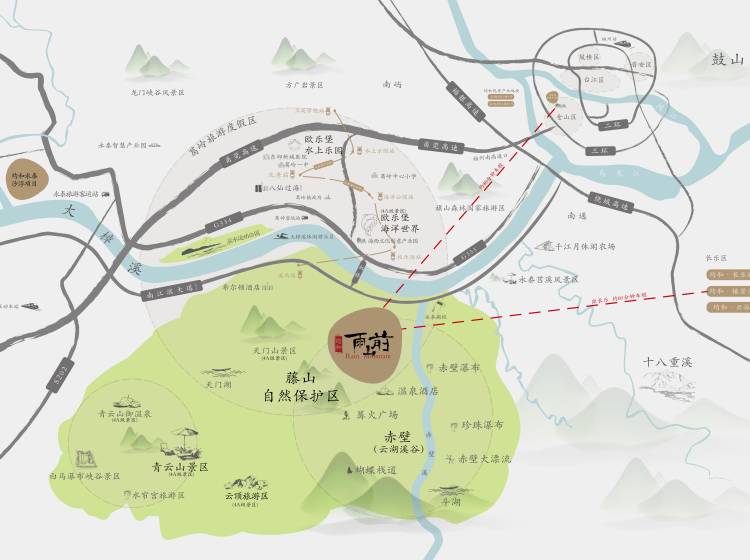 均和·雨山前位于福州后花园,永泰赤壁大樟溪畔,与冲绳、夏威夷等景点同位于北纬26°抢占山、林、溪、谷等自然大境,旅游资源充沛,是中国企业500强——均和集团的度假开山之作。扼守黄金枢纽,从甬莞高速出发,融入福州半小时生活圈,瞬达周边各大景点。