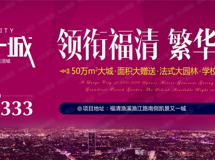 凯景又一城,是凯景集团继凯景国际城后的又一力作,项目位于福清渔溪渔江路南部,凯景国际城项目的东面。项目占地约156亩,容积率2.8,建筑密度28% ,绿化率达30%,总建筑面积近38万㎡。共规划27幢17-33层的高层住宅和一幢独立幼儿园及近2万㎡沿街商业。