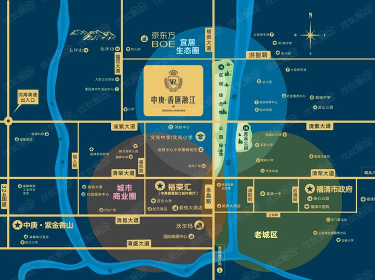 中庚•香匯融江所处北部新城片区是福清跨越发展的重要经济增长区,将充分利用自然环境优势与高新产业集群龙头动力打造为产城融合的北部生态/宜居组团,以期实现对本区城市形象和城市品牌的塑造。