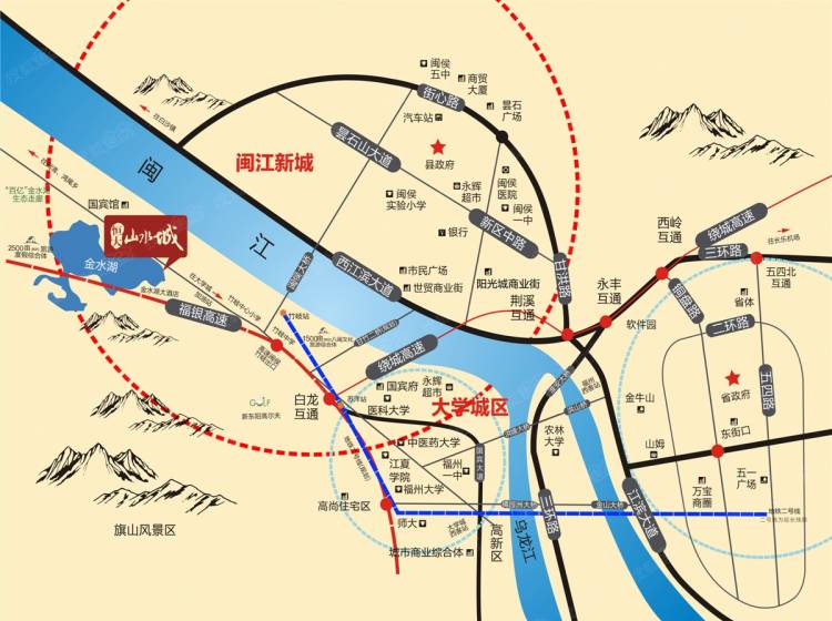福州恒大山水城,位于福州市闽侯县竹岐乡金水湖畔。项目规划总占地面积约200亩,规划总建筑面积20万平方,项目将打造成为集江、湖、山三景为一体的超低密度住区项目