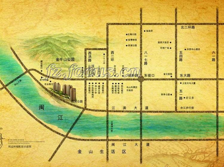 融汇江山位于福州闽江北岸,鼓楼区杨桥西路,西河公园西侧,金牛山公园南面,是融汇集团2008年在市中心打造的新品力作。
